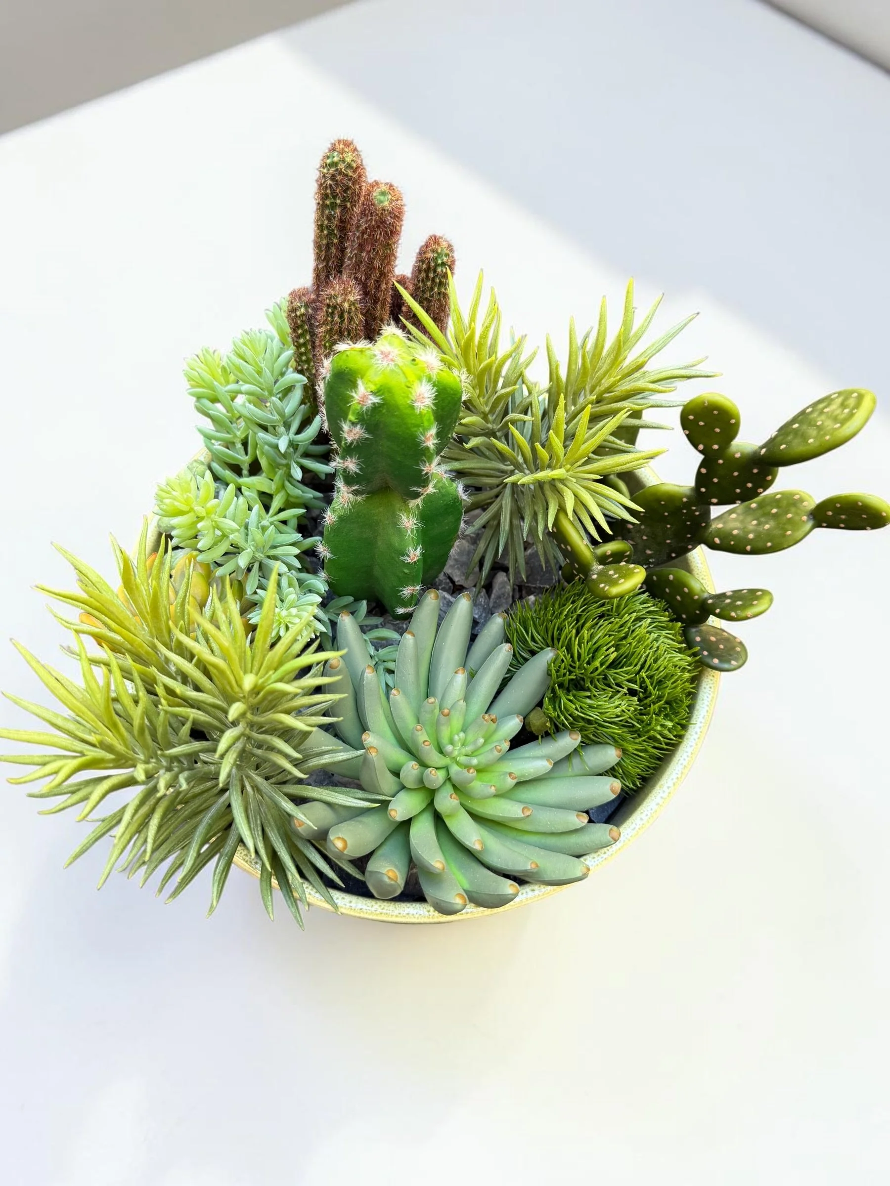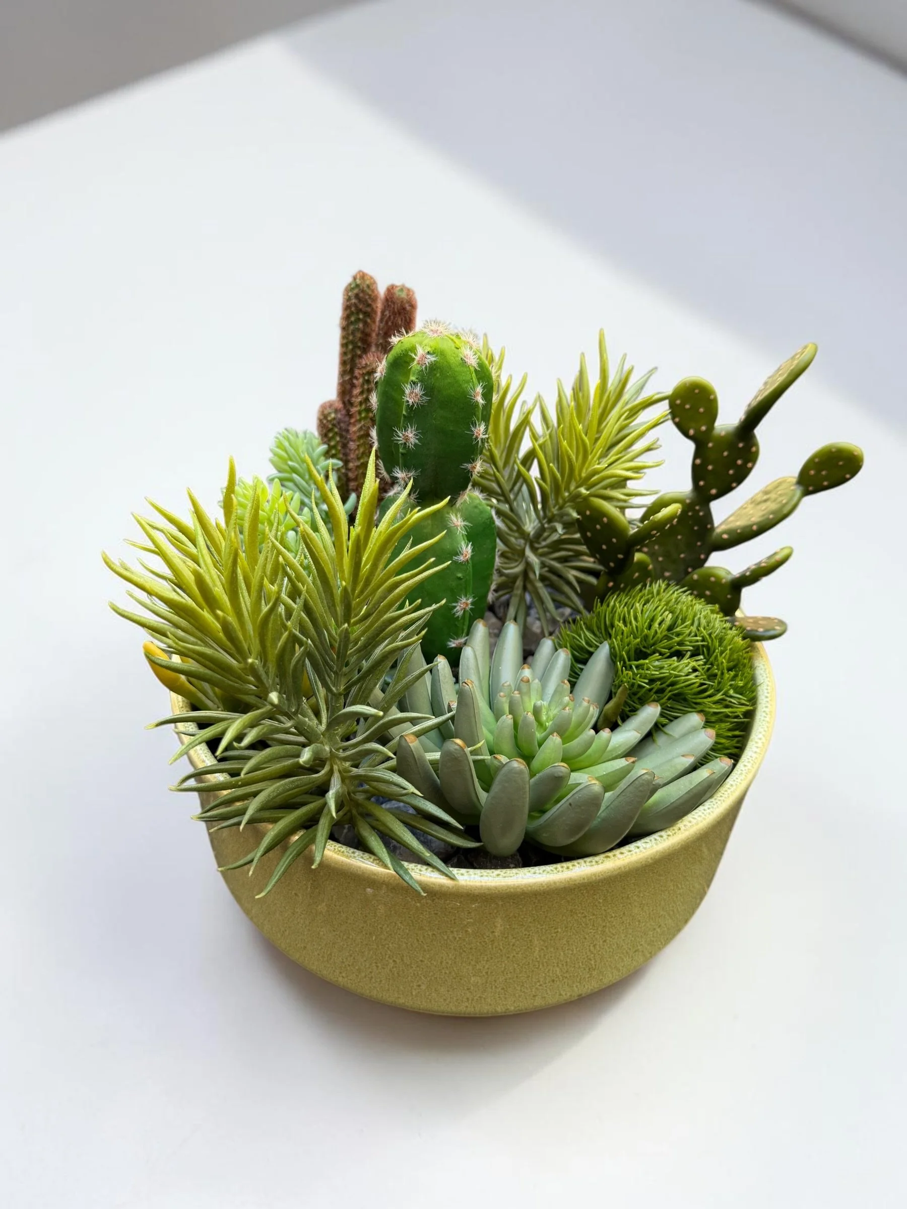 Curated Faux Succulent & Cactus Garden — Olive Ceramic Bowl