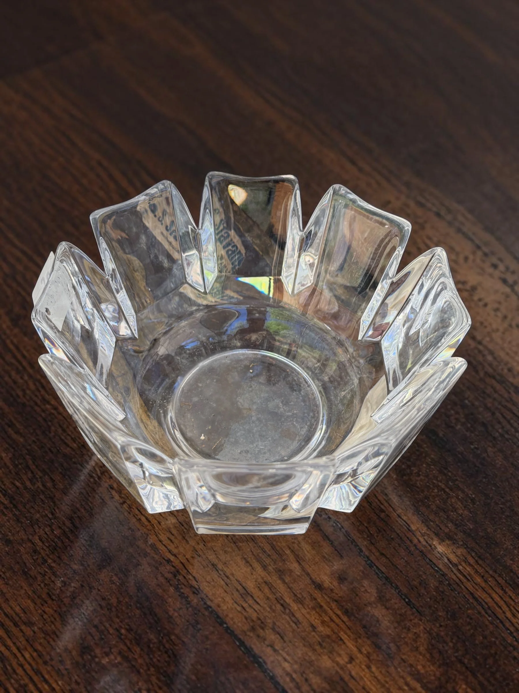 Thick-walled crystal centerpiece bowl with a sculptural lotus petal rim and a subtle iridescent finish that shifts with the light. Heavy and architectural, designed to anchor a dining table, console, or coffee table. A statement piece that earns its place in any room.