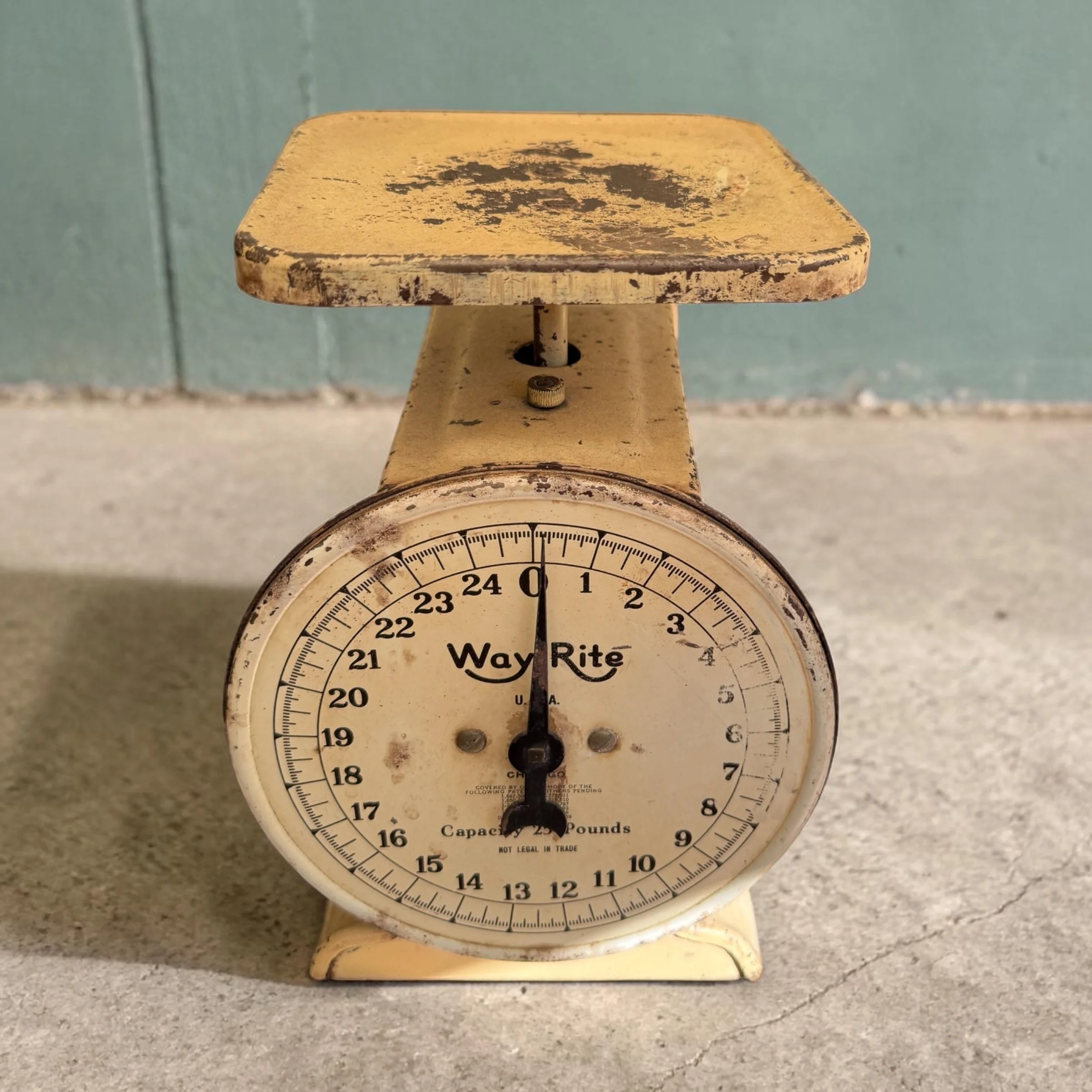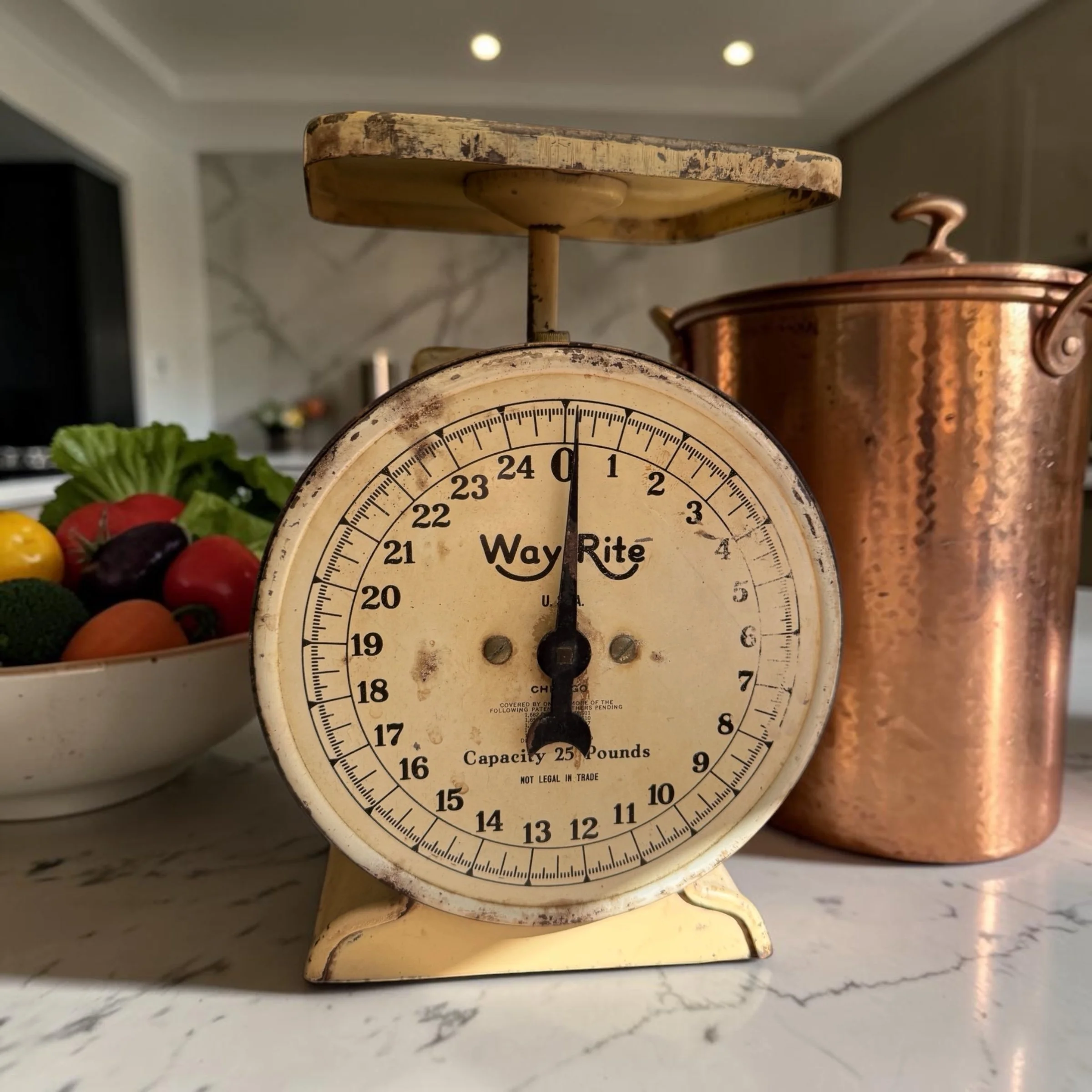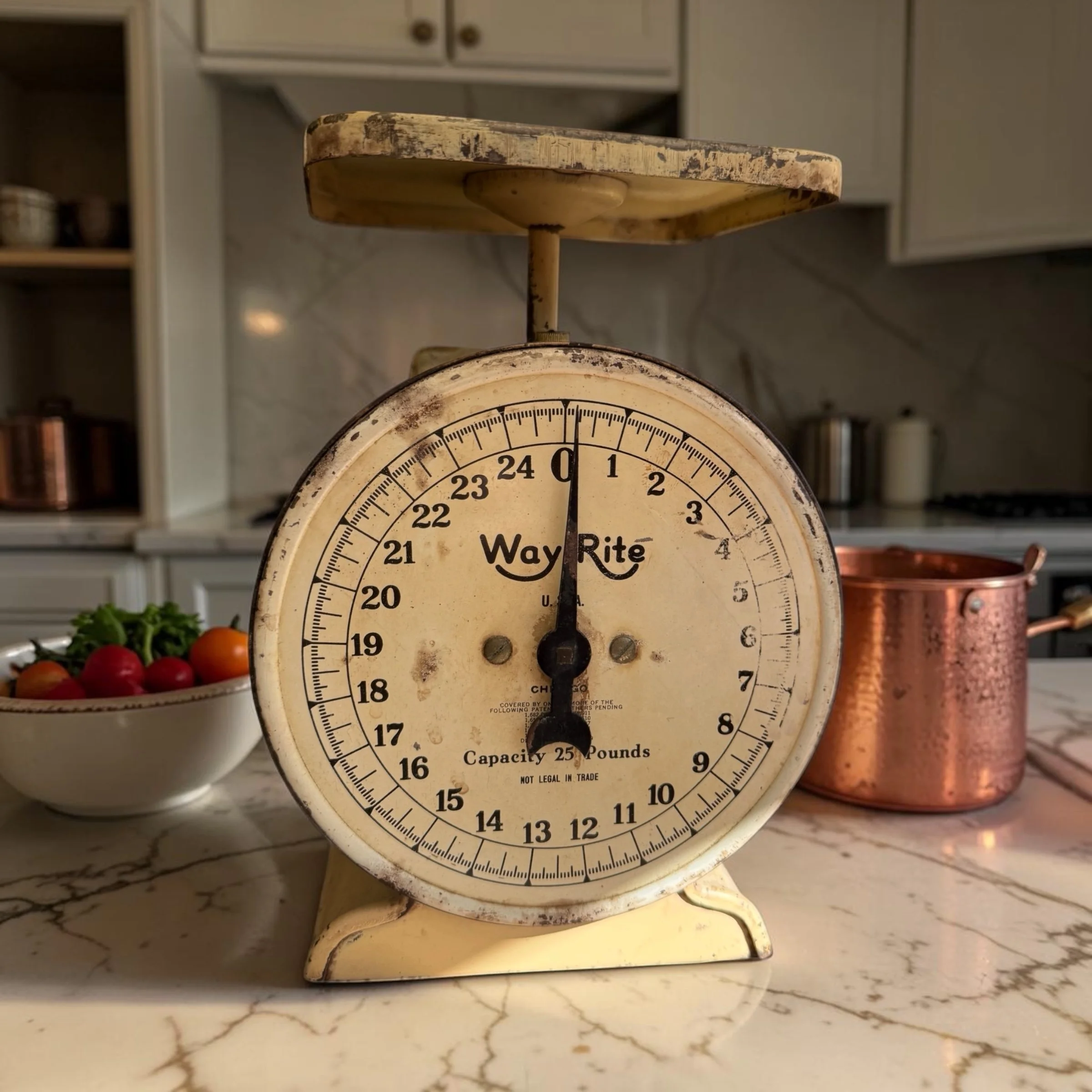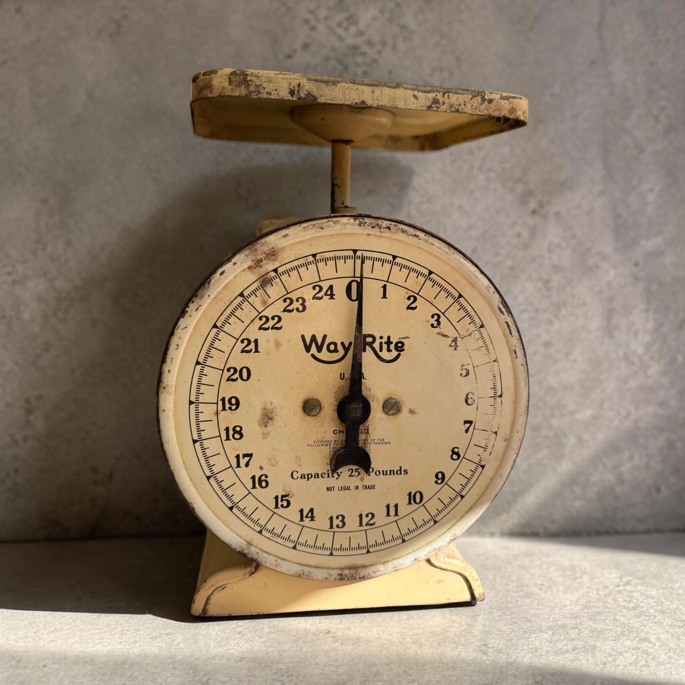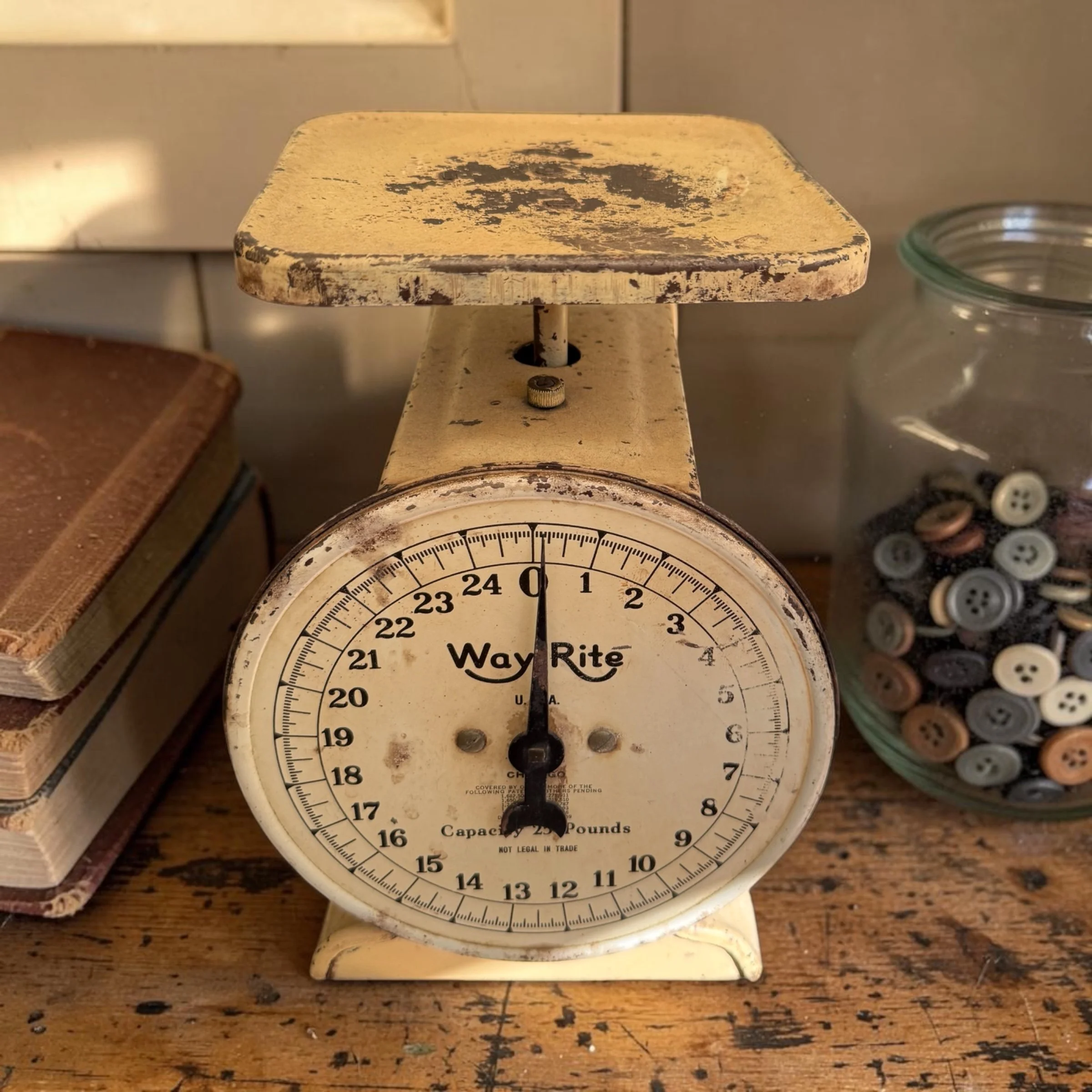 Vintage Way Rite kitchen scale, 25 lb capacity — cream/ivory paint with gorgeous chippy patina, original dial face, flat weighing platform. A farmhouse-chic statement piece as functional as it is beautiful. ~9"H x 6"W x 6"D, approx. 4–5 lbs. ⚖️✨
