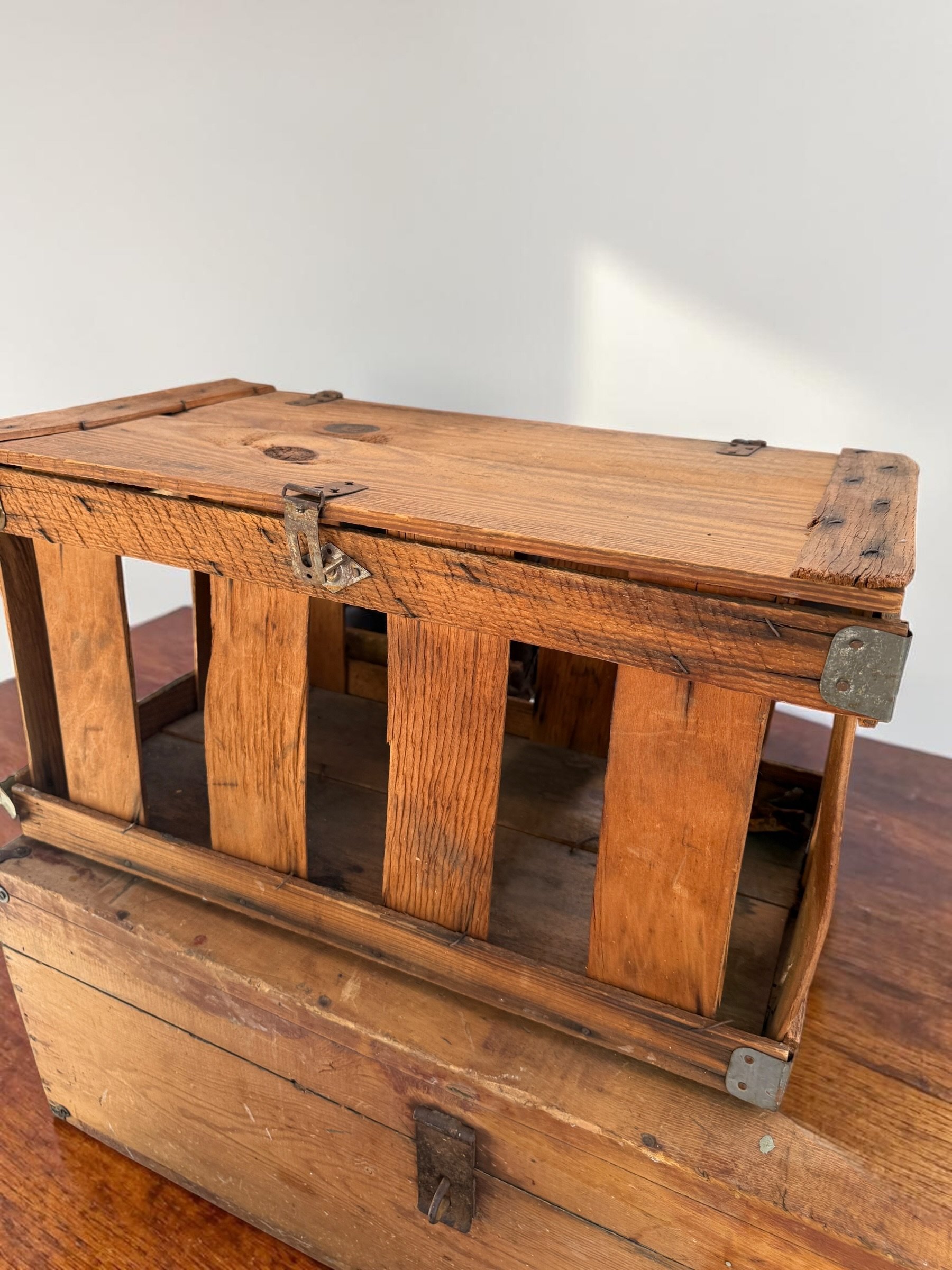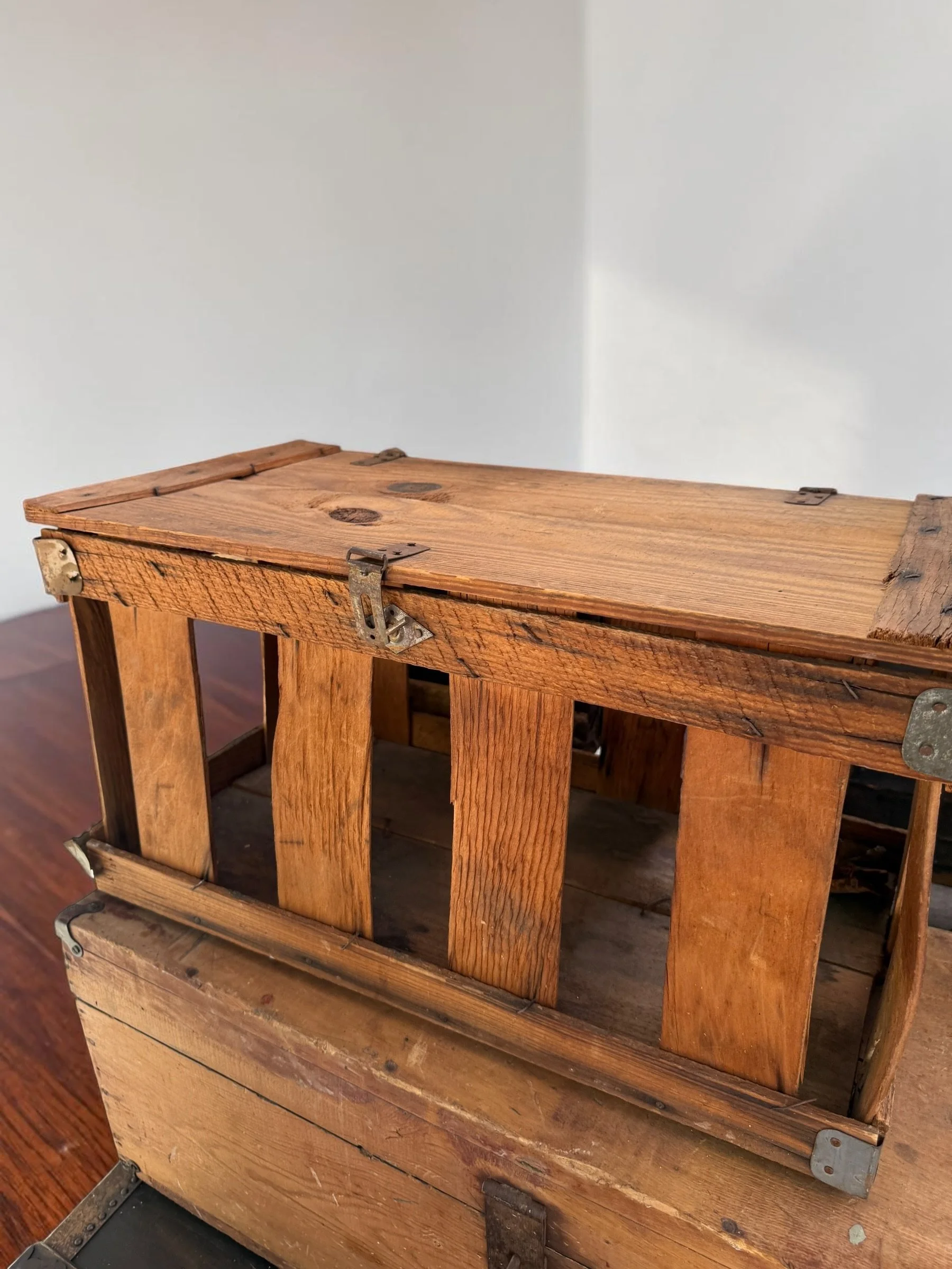 Rustic slatted wood crate with hinged solid-panel lid, original metal corner brackets, and front latch hardware. Warm honey-brown oak with deep grain, nail holes, and authentic age wear throughout. Likely used as a poultry or produce carrier. Stunning as a display box or coffee table accent. Approx. 18–22"L x 10–12"W x 10–12"H. ~8–12 lbs.