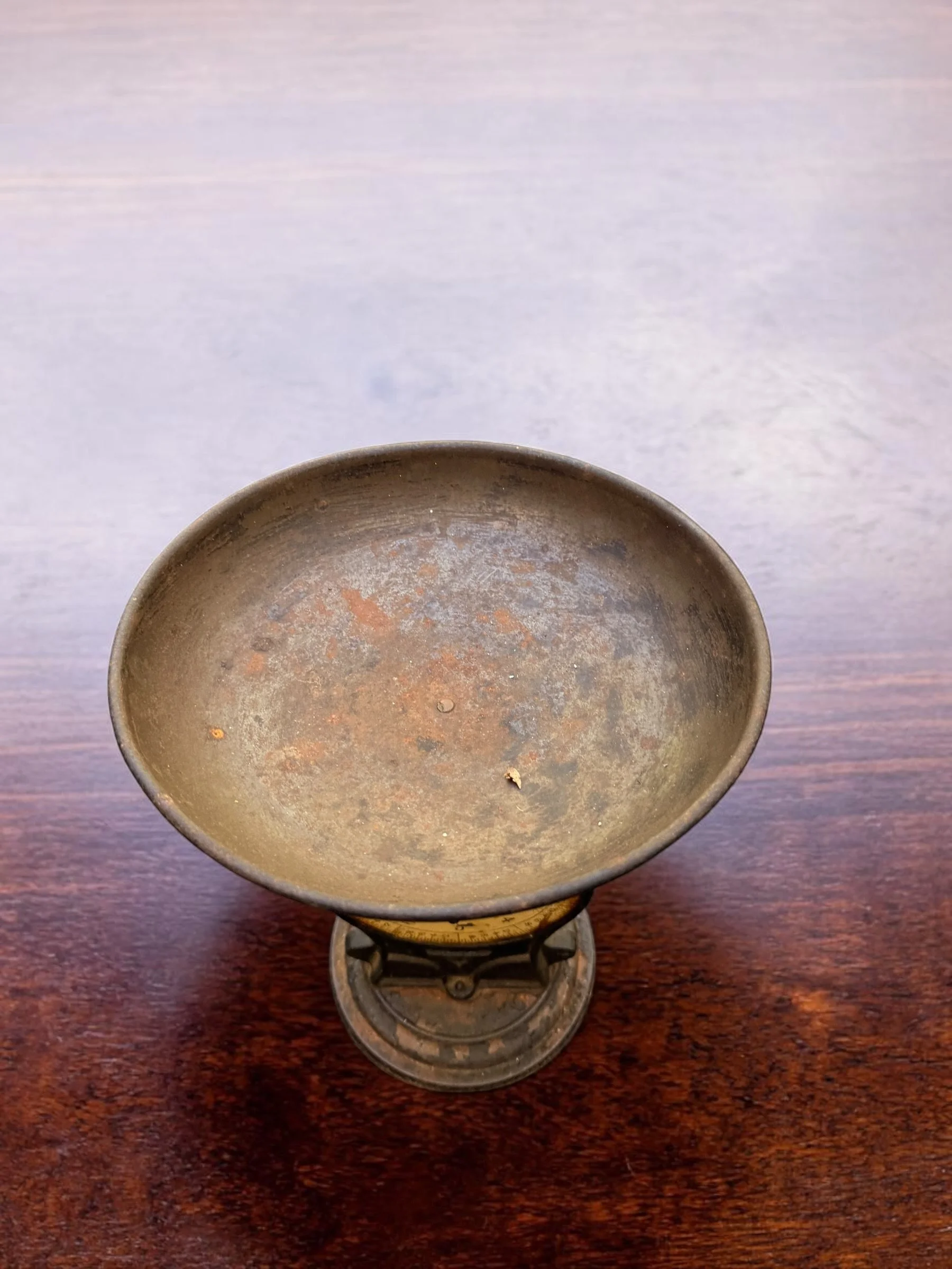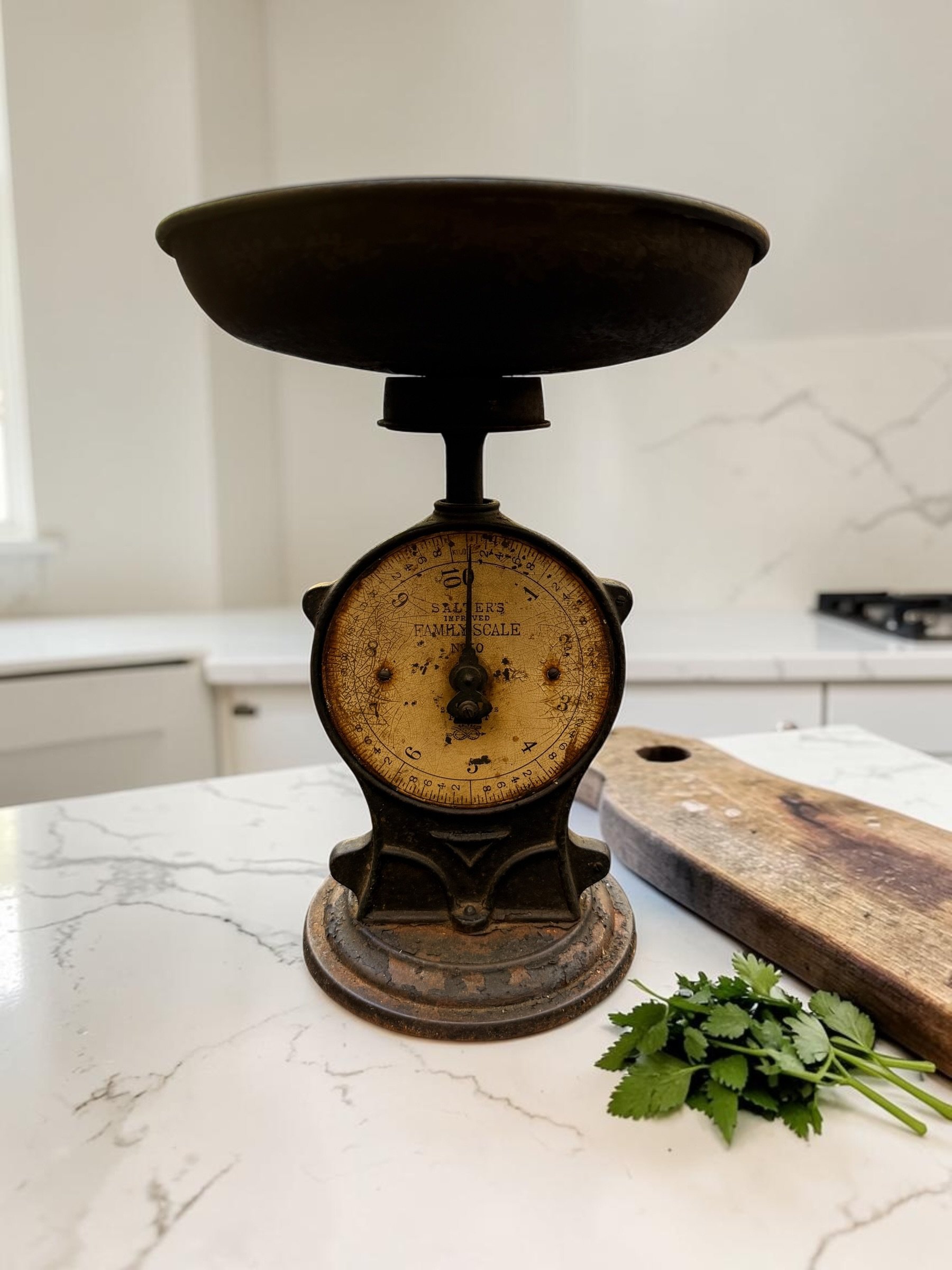 A beautifully aged Salter's Improved Family Scale with original brass-faced dial, cast iron pan, and ornate pedestal base. Deep patina, worn numerals, and rusted surface texture make this a standout kitchen or shelf accent. Fully decorative. A collector's piece with serious presence.