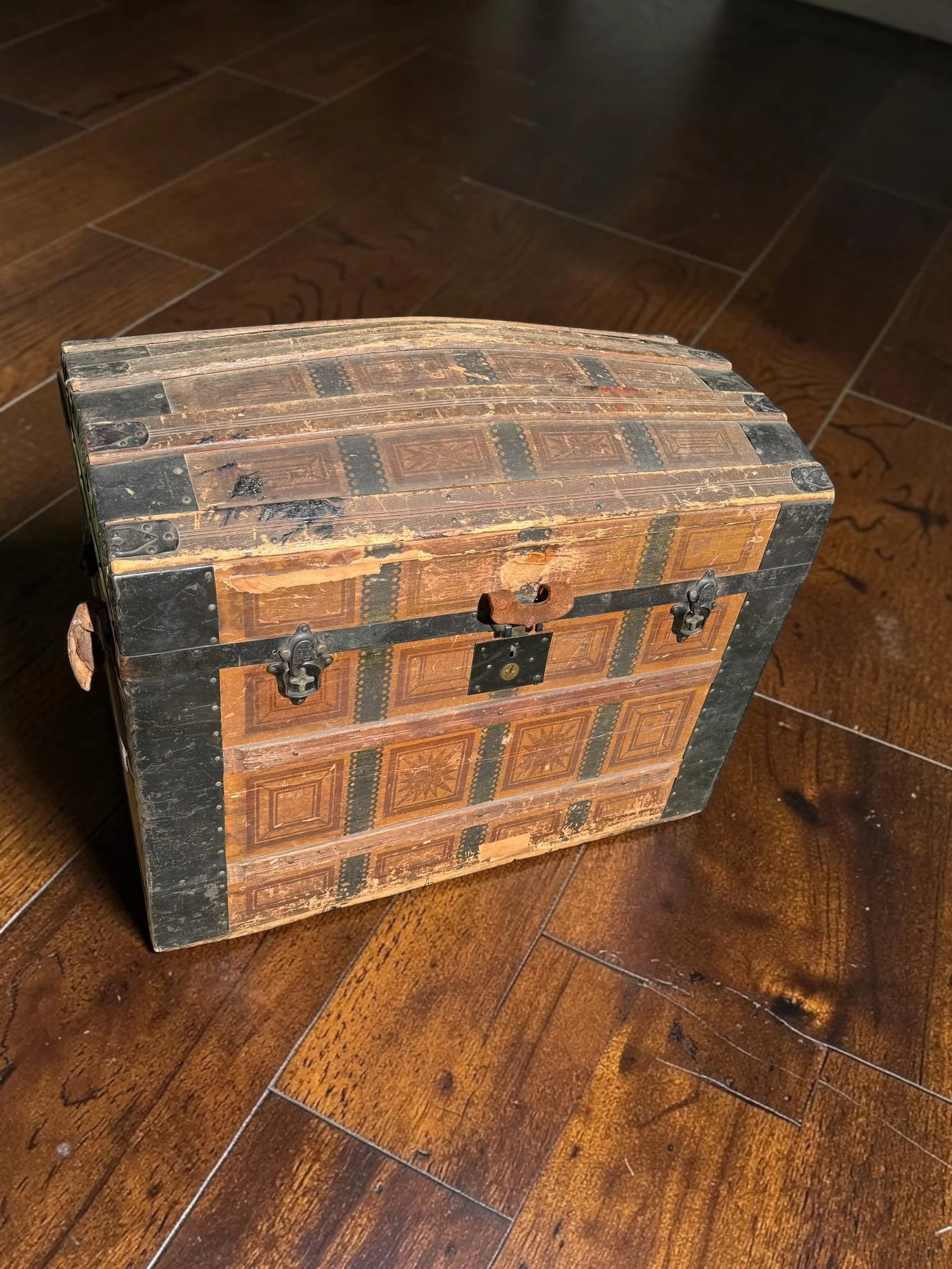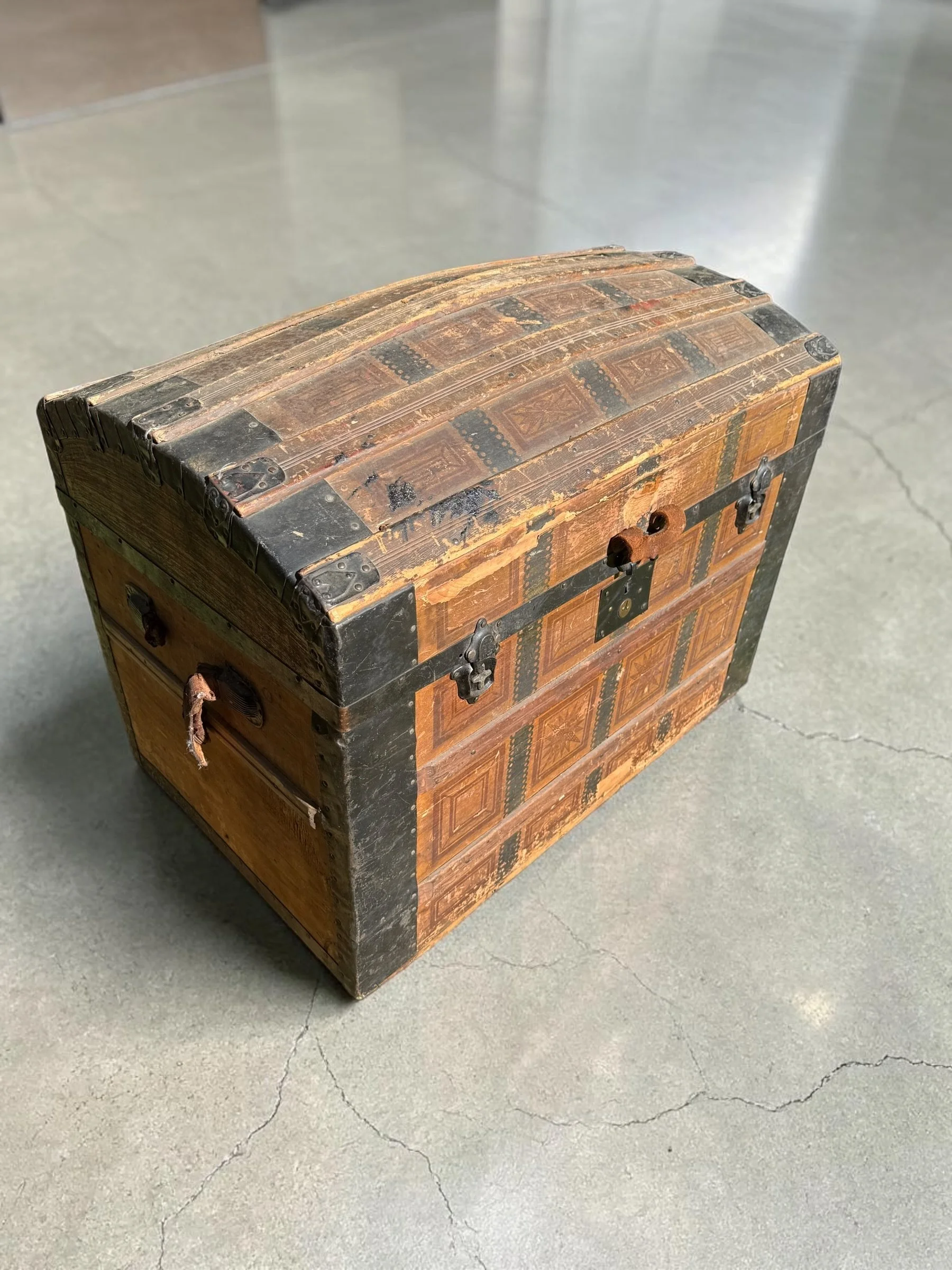 A commanding Victorian-era dome-top steamer trunk with embossed wood paneling, original iron hardware, and aged metal banding. Warm amber tones, original latch and side handles intact. Beautifully worn patina tells a century of stories. Use as a coffee table, blanket chest, or entryway statement — this one stops people in their tracks.