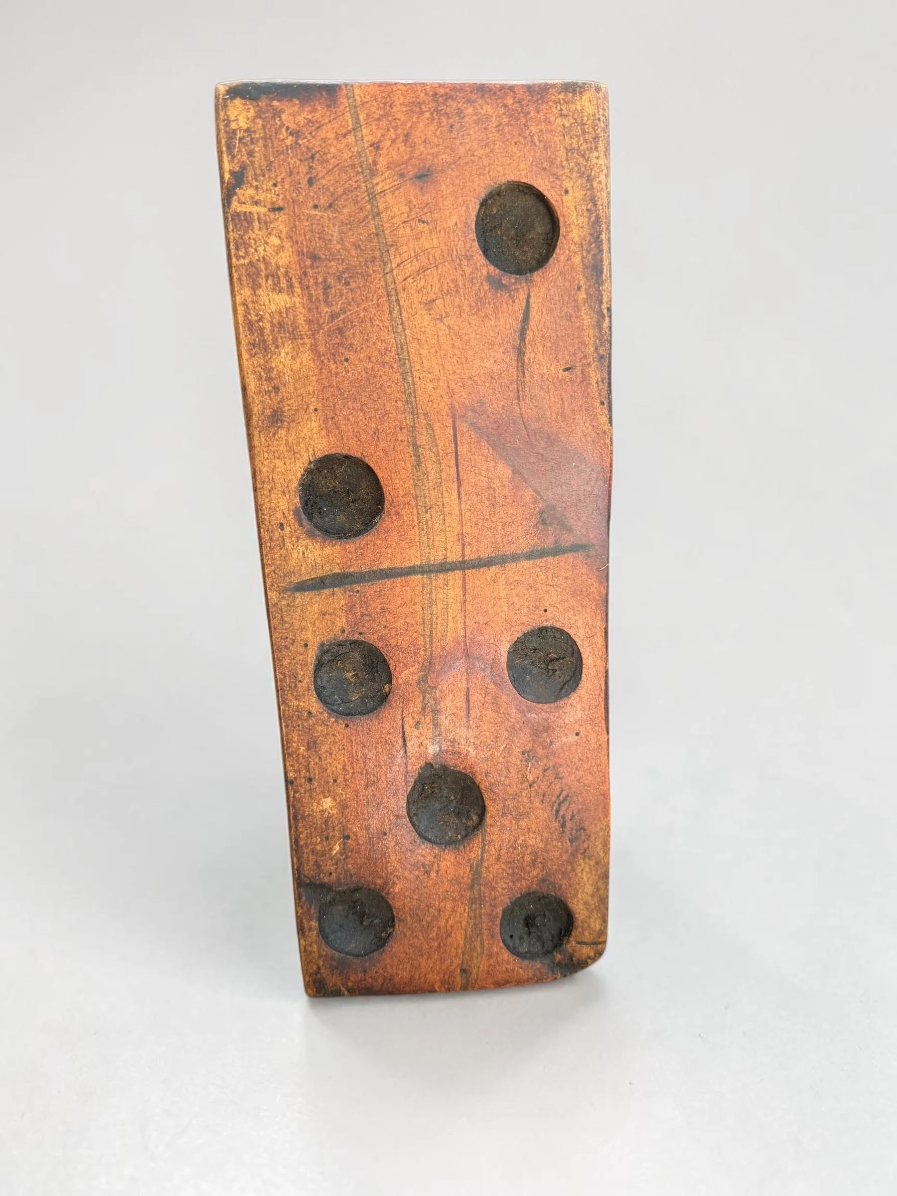 Solid wood oversized domino with deep amber patina, carved pips, and a center dividing line. Heavy wear, scratches, and aged surface add authentic character. A bold, sculptural game piece. Approx. 7–8"H x 3–3.5"W x 1"T. ~1–2 lbs.